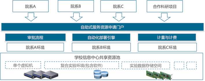 针对高校与其他行业的差异化,建设属于高校本身的全局资源池,基于资源需求请按需分配给各个院系,并全面监控各项信息资源运行情况:构建统一的大二层网络环境,实现信息资源的全局调度:实现信息资源的运维监控和计量管理。