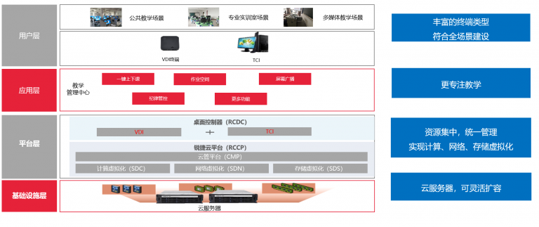 云桌面系统由客户端层、虚拟化层和管理层组成,三个层面紧密结合,为用户提供安全、可靠的教学环境。